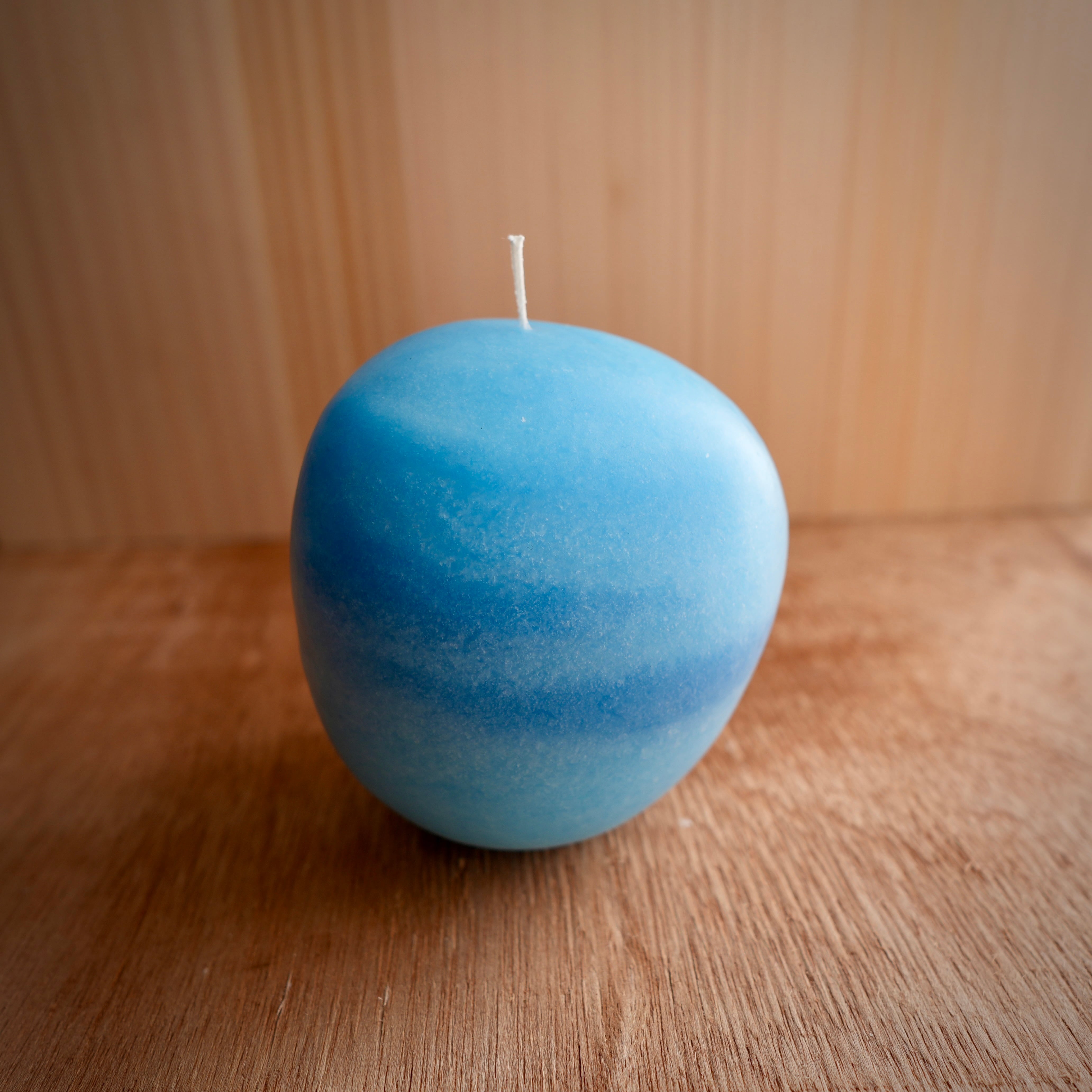 蝋が柔らかいうちにコロコロ転がして造形したものです。色は瀬戸内ブルーに、凪いだ海の海面に見える潮目(写真参照)の模様を取り入れてました。