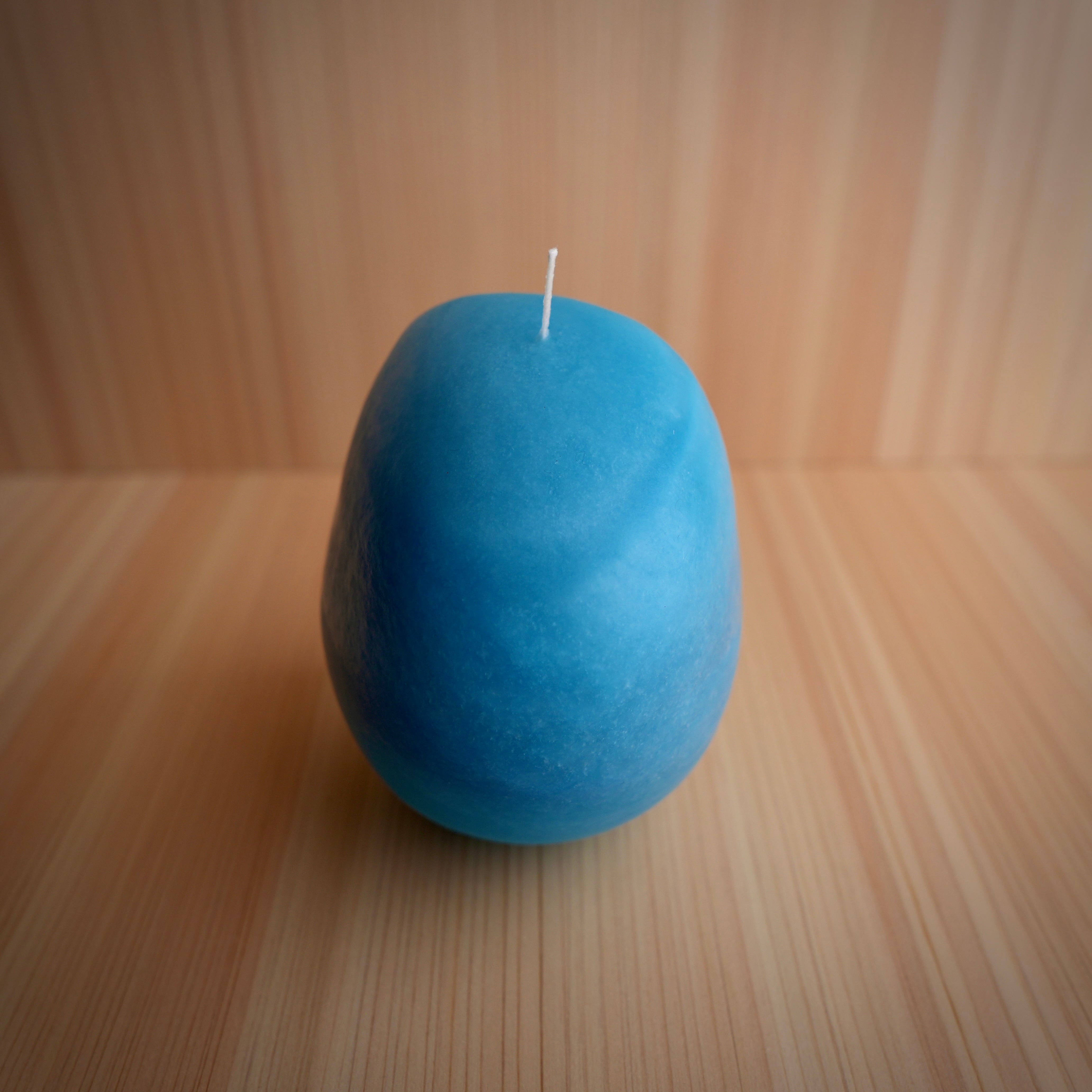 蝋が柔らかいうちにコロコロ転がして造形したものです。色は瀬戸内ブルーに、凪いだ海の海面に見える潮目(写真参照)の模様を取り入れました。
