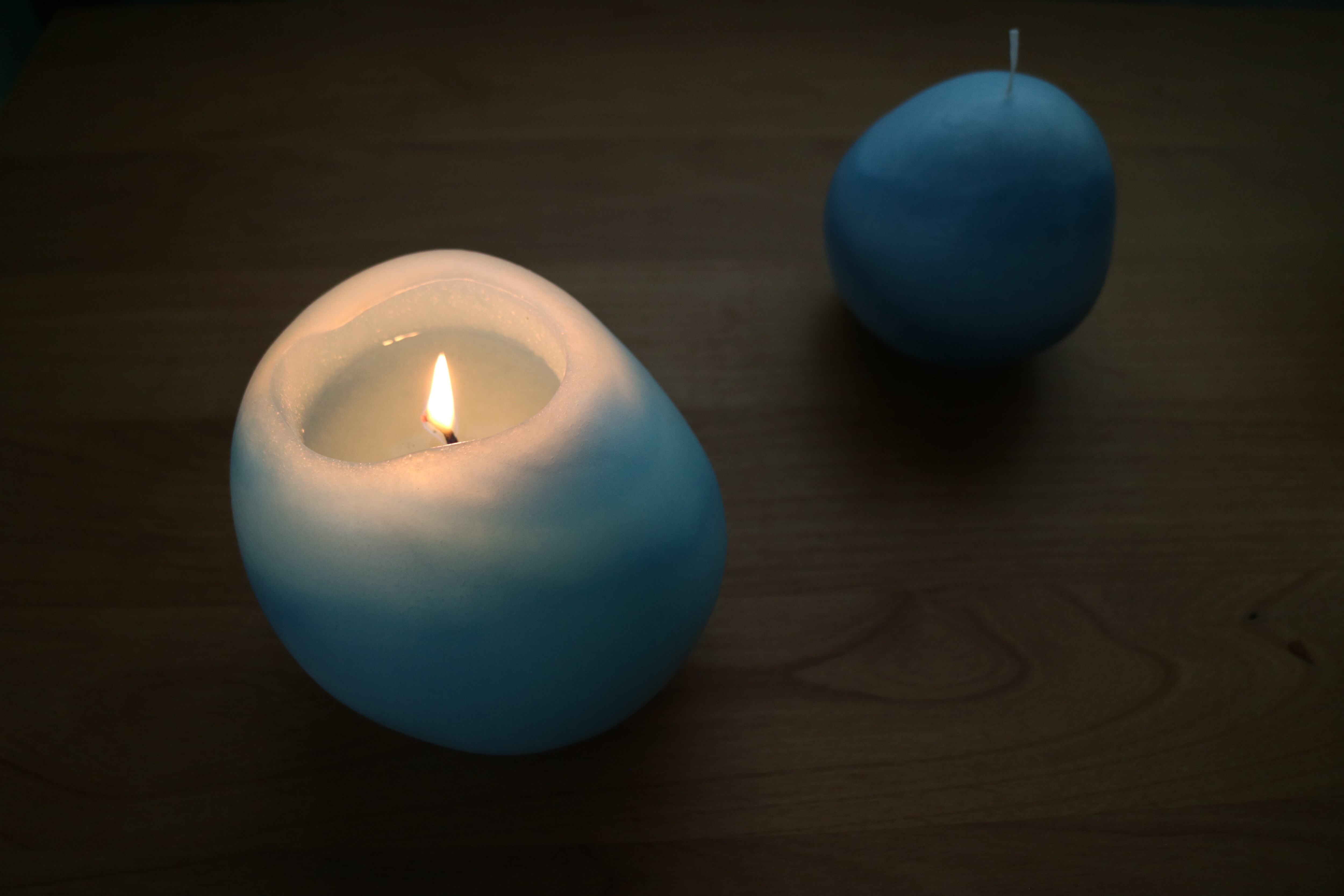 蝋が柔らかいうちにコロコロ転がして造形したものです。色は瀬戸内ブルーに、凪いだ海の海面に見える潮目(写真参照)の模様を取り入れました。
